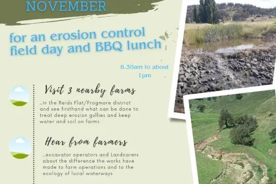 If you have erosion issues on your land, big or small, we invite you to come to the Hovells Creek Landcare Group field morning on Saturday 15th November to see and hear about some of our funded erosion control works on three nearby farms in the Reids Flat district (between Cowra and Boorowa).