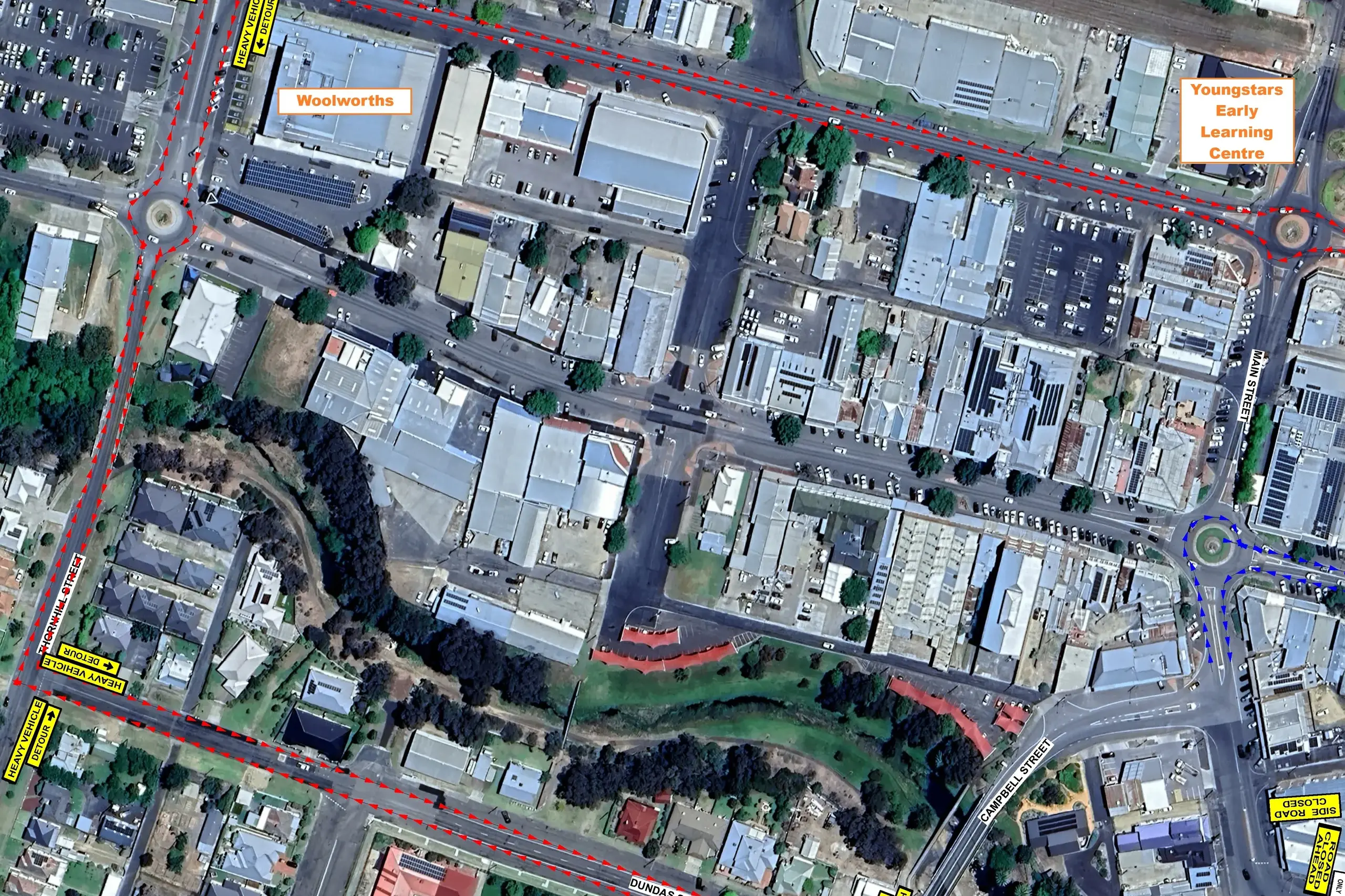 The heavy vehicle detour will be via Dundas Street, Thornhill Street and Lovell Street heading north, and in reverse for heavy vehicles heading south.